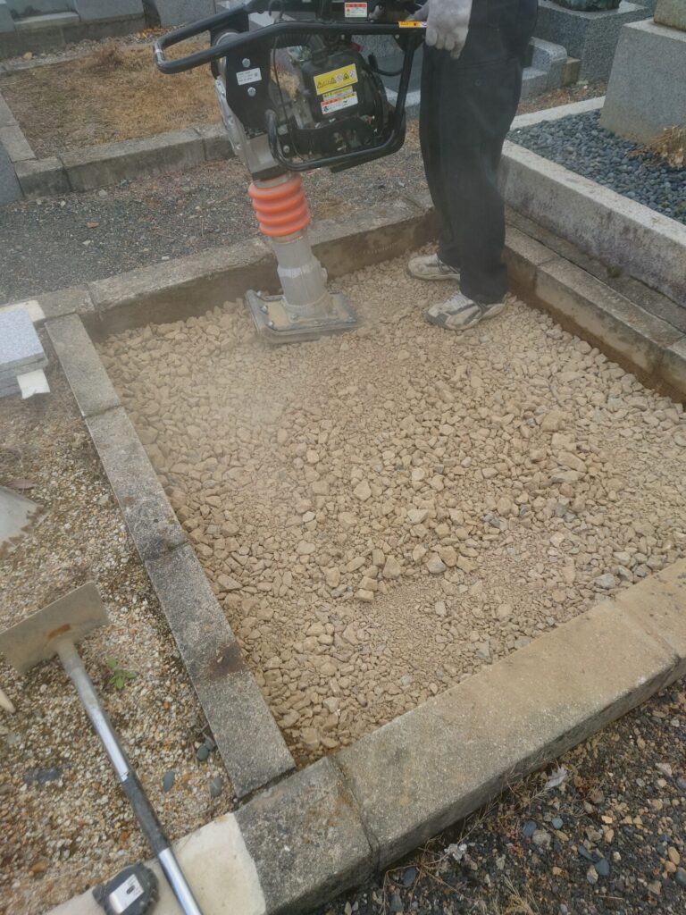 掘り終えたら砕石を入れランマーと言う機械で地盤を固めていきます。
