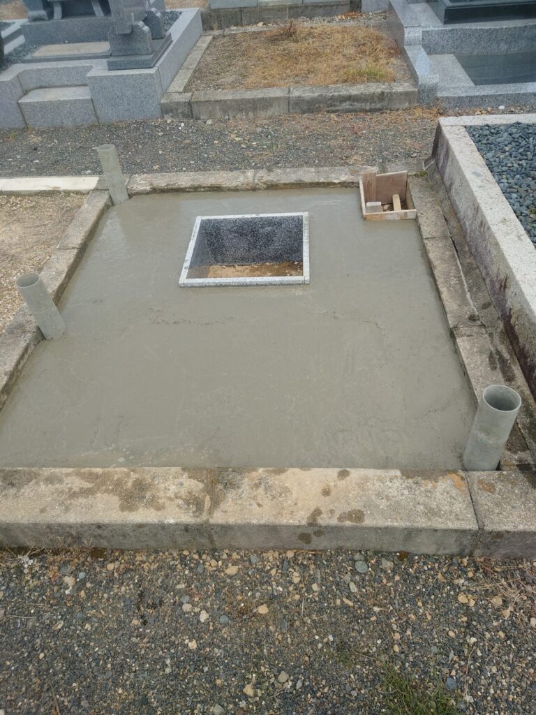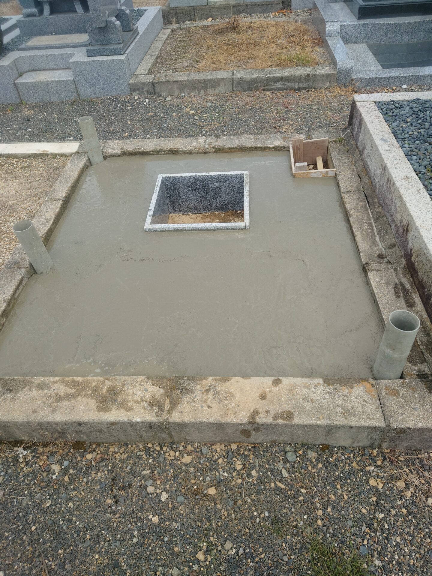 今回は、敷地の周りに石の囲いがないので納骨室の石も据え付けてから生コン入れでした。