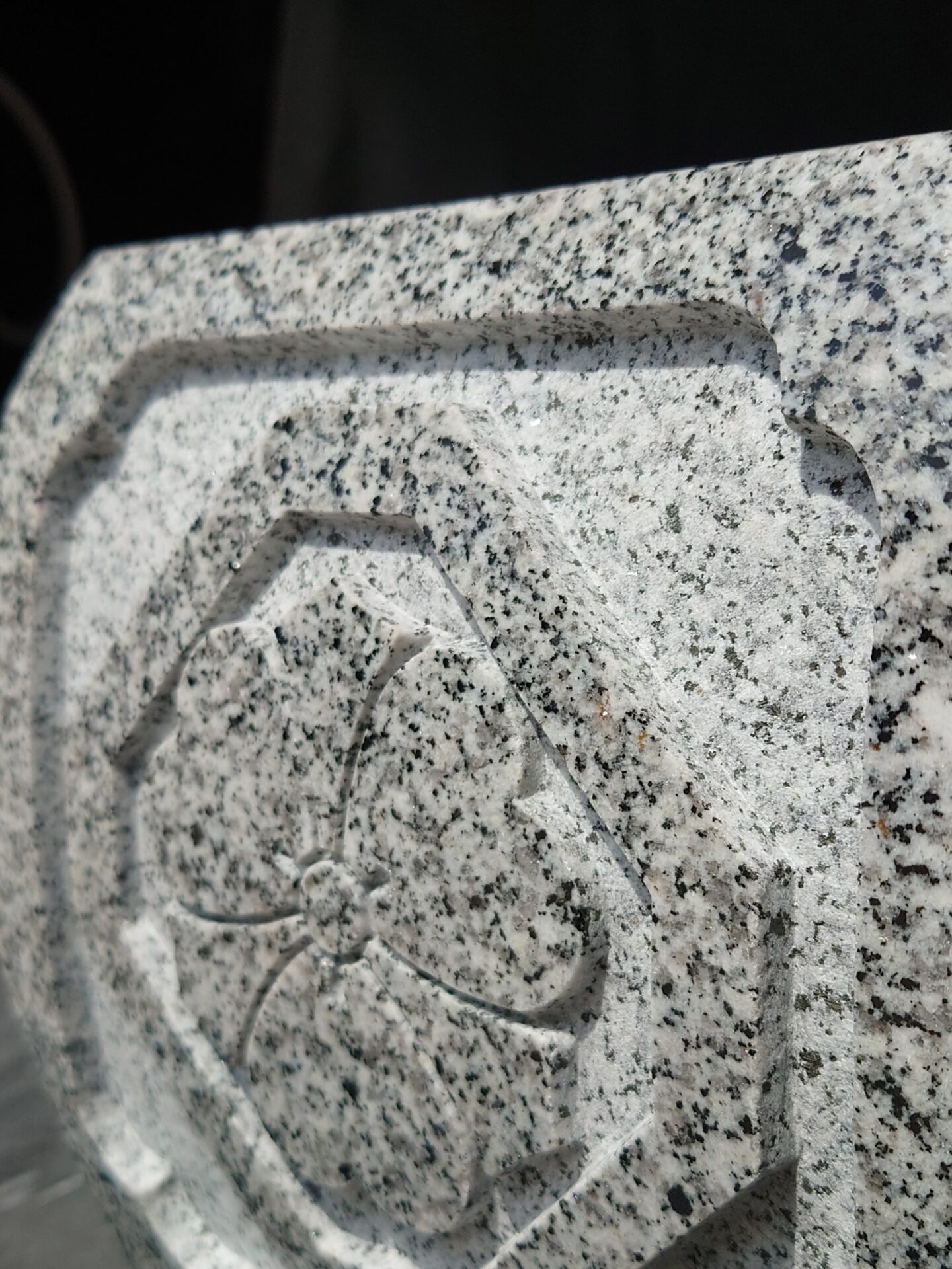 今回竿石に「〇〇家の墓」と彫らせて頂いたので、供物台は蓮を彫らせて頂きました。