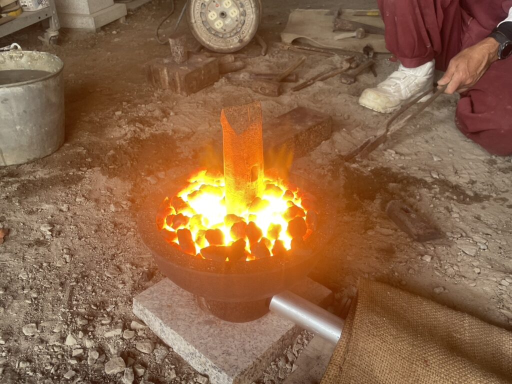 このふいごで風を送りコークスを燃やして鉄製の道具を焼いている動画を撮る作業をしました。