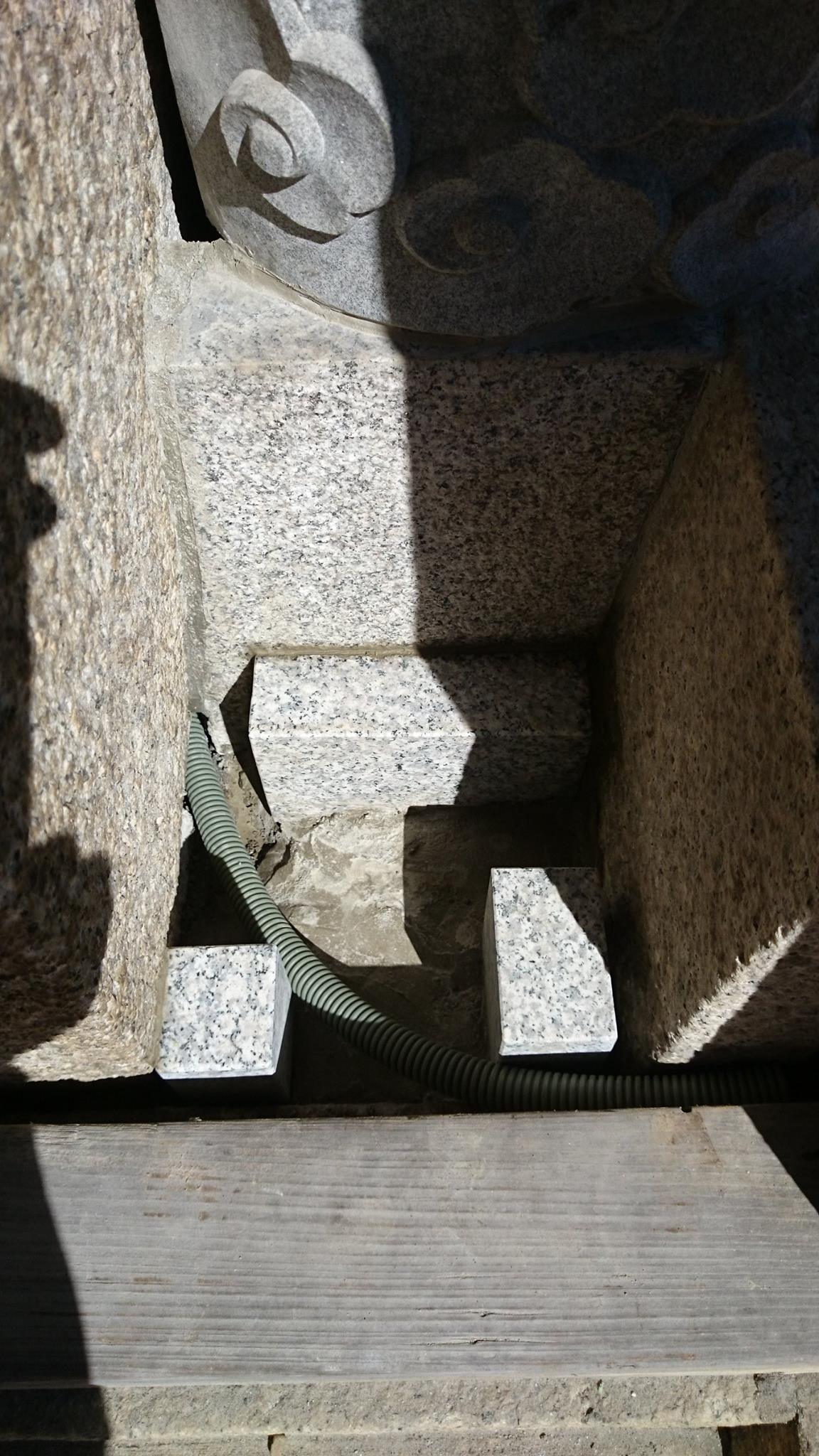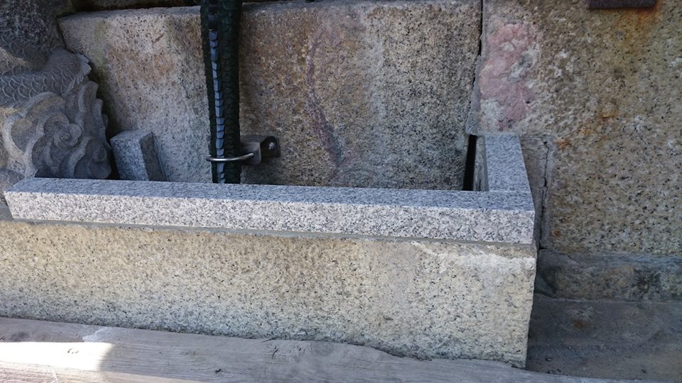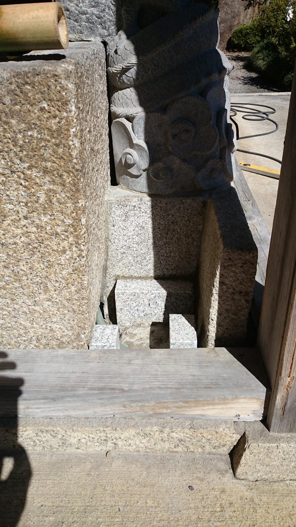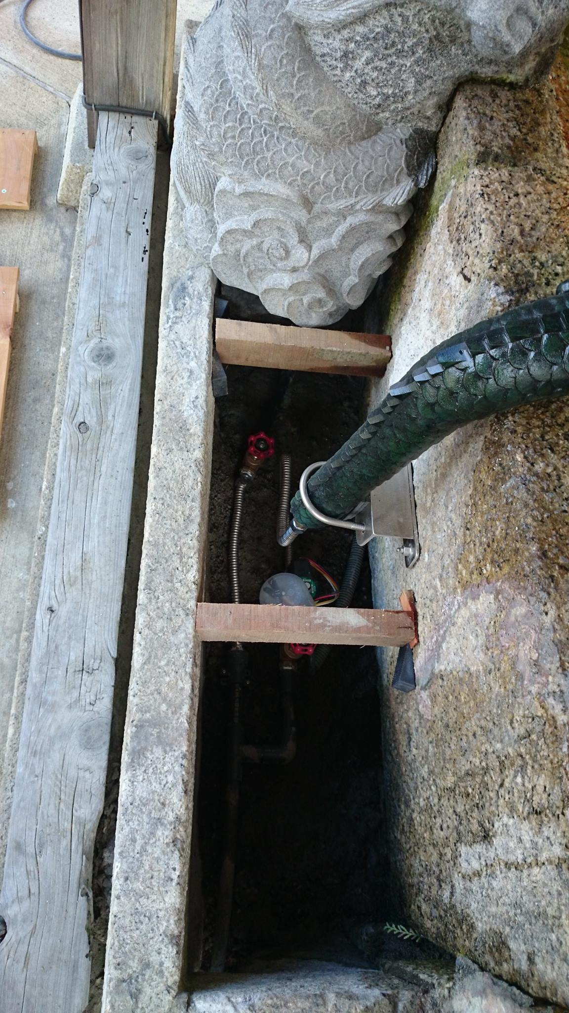 十年位前に氏神さんの沙沙貴神社に作らせてもらった龍の蛇口。新しく銅製の龍の蛇口を設置され、水の配管が見えるので蓋をしてほしいと言う依頼。どうしよう?