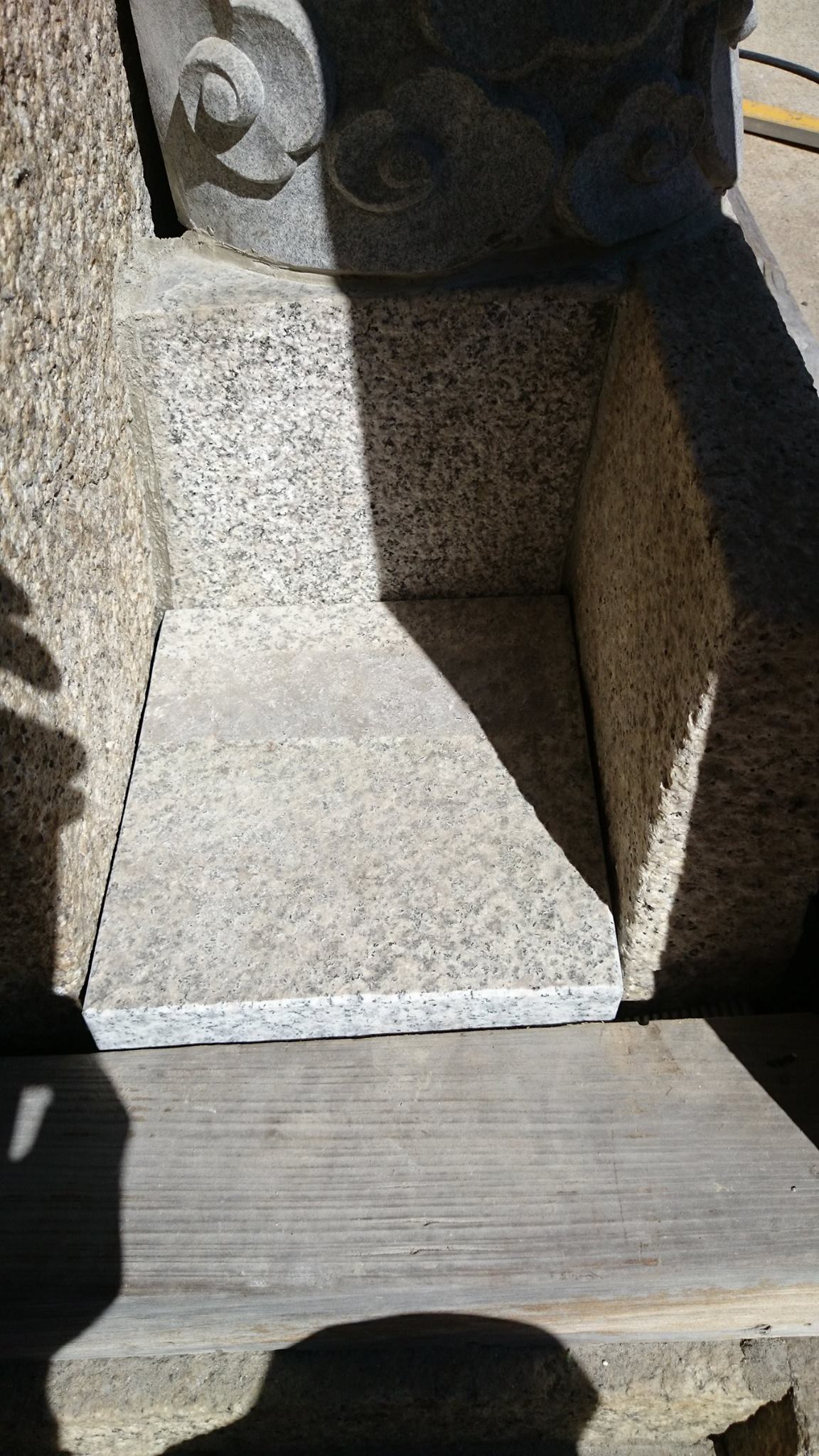 銅製の蛇口のステンレス金具を隠すのに周りに石でかさ上げして蓋をのせました。石の龍と銅の龍の所の切り合わせがなかなかできませんでした。