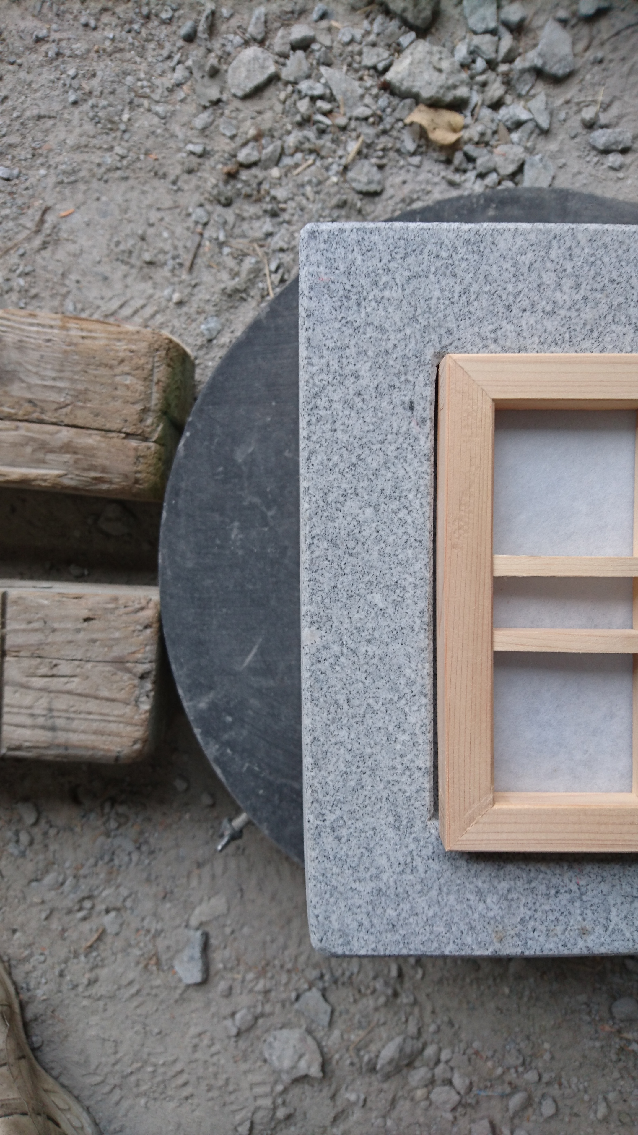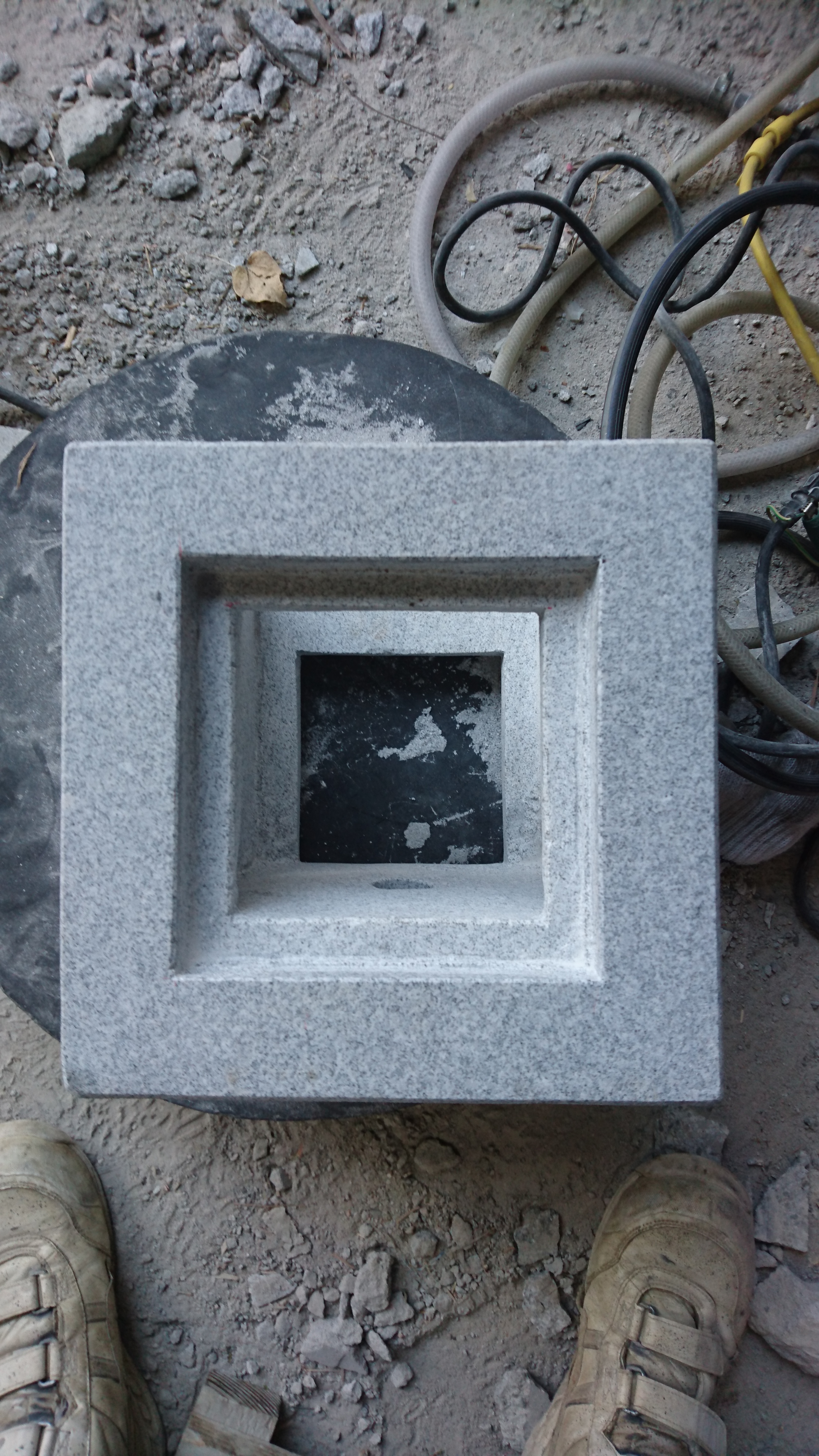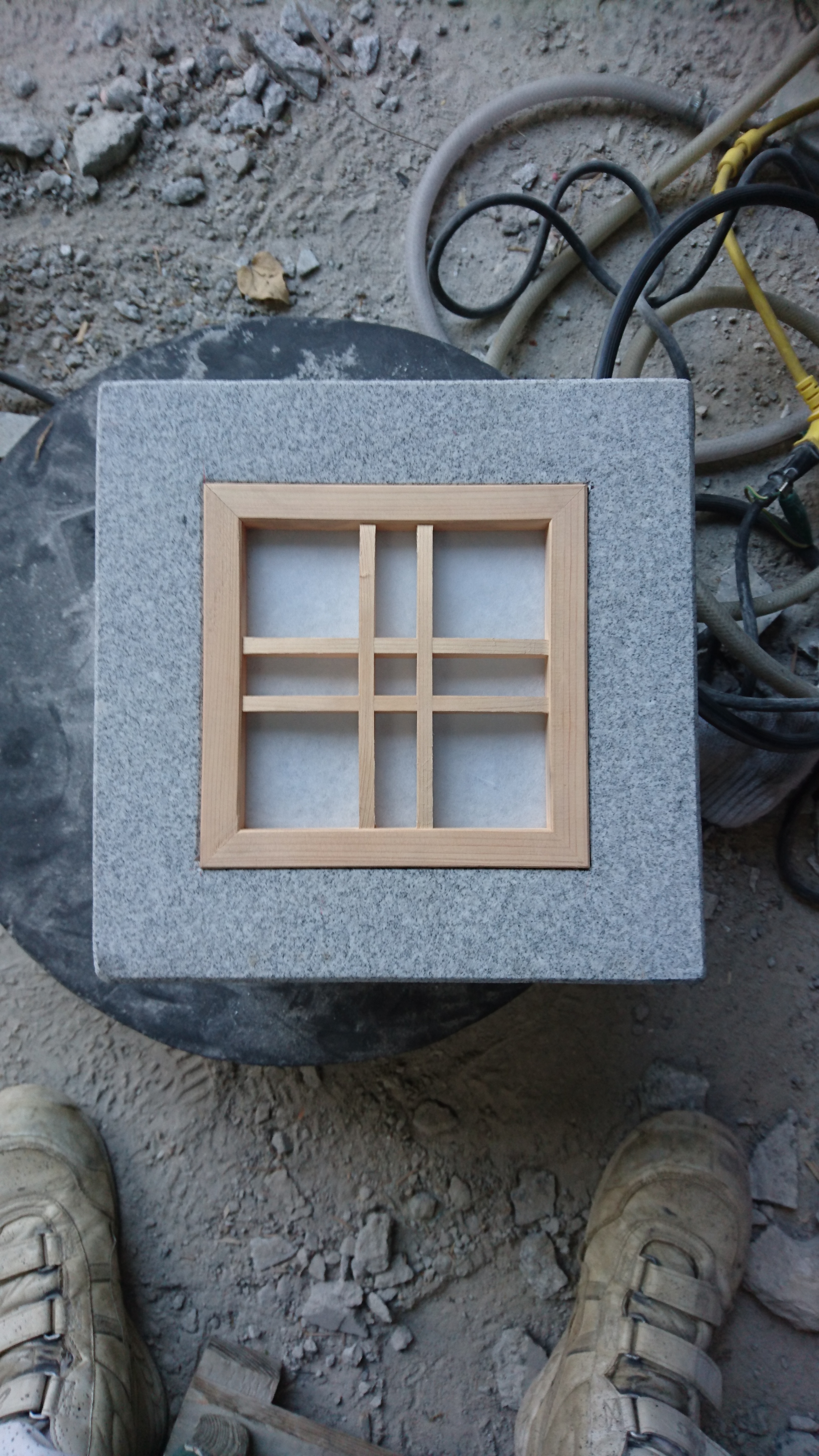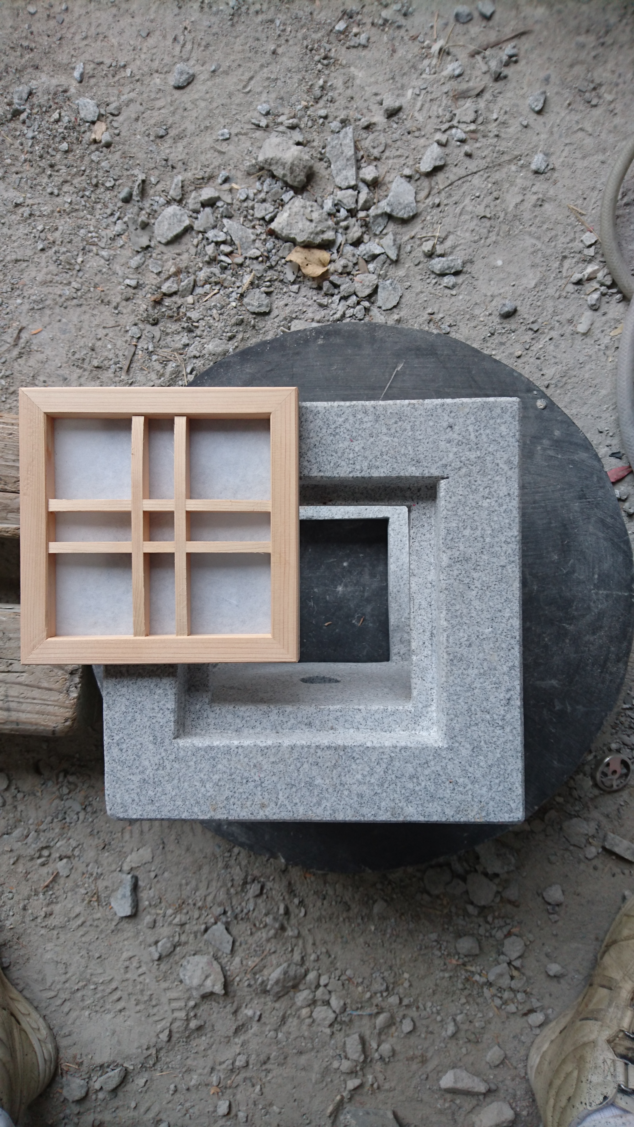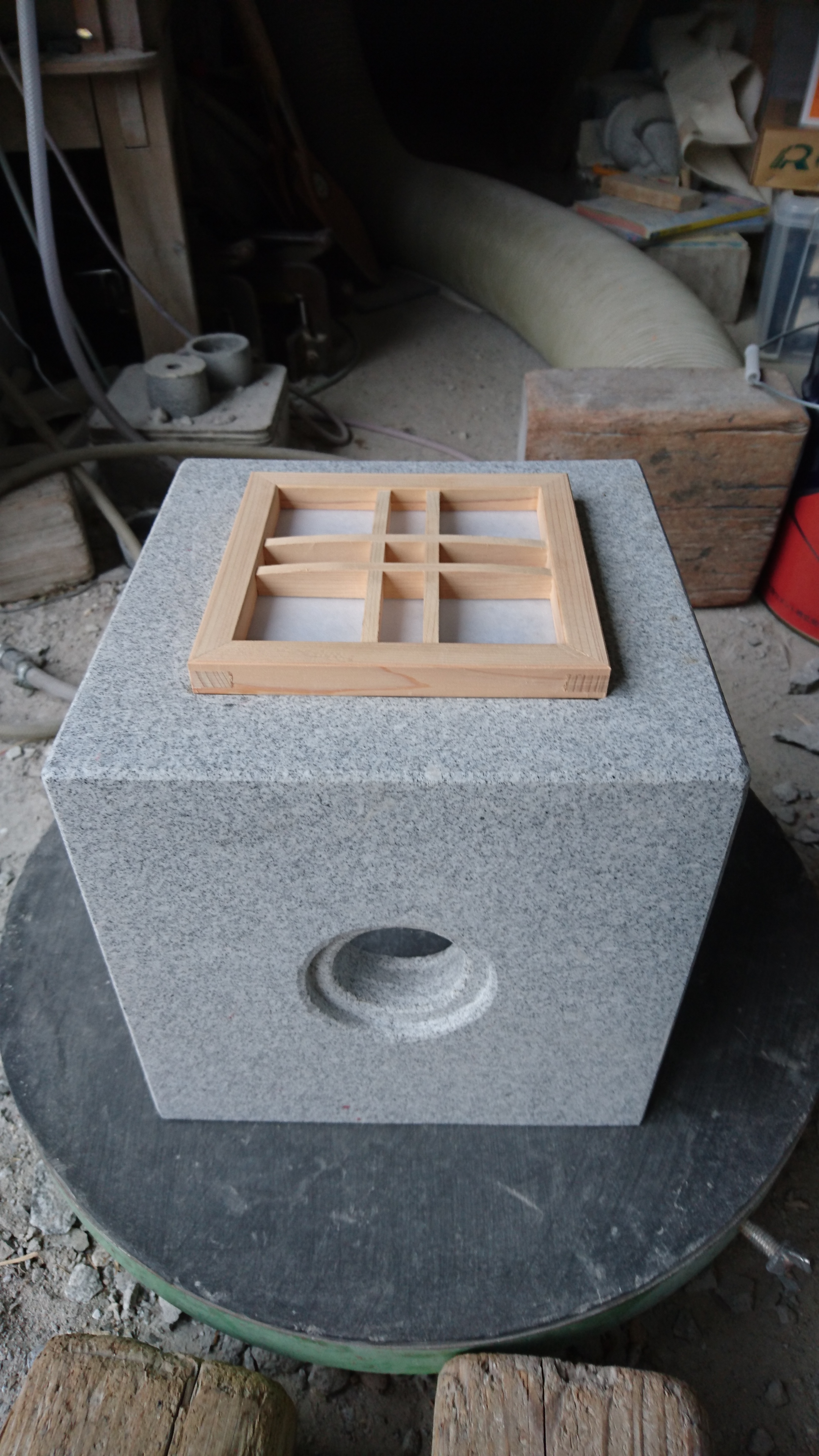 火袋の上に建具をのせ、まわりの石の幅を揃えます。