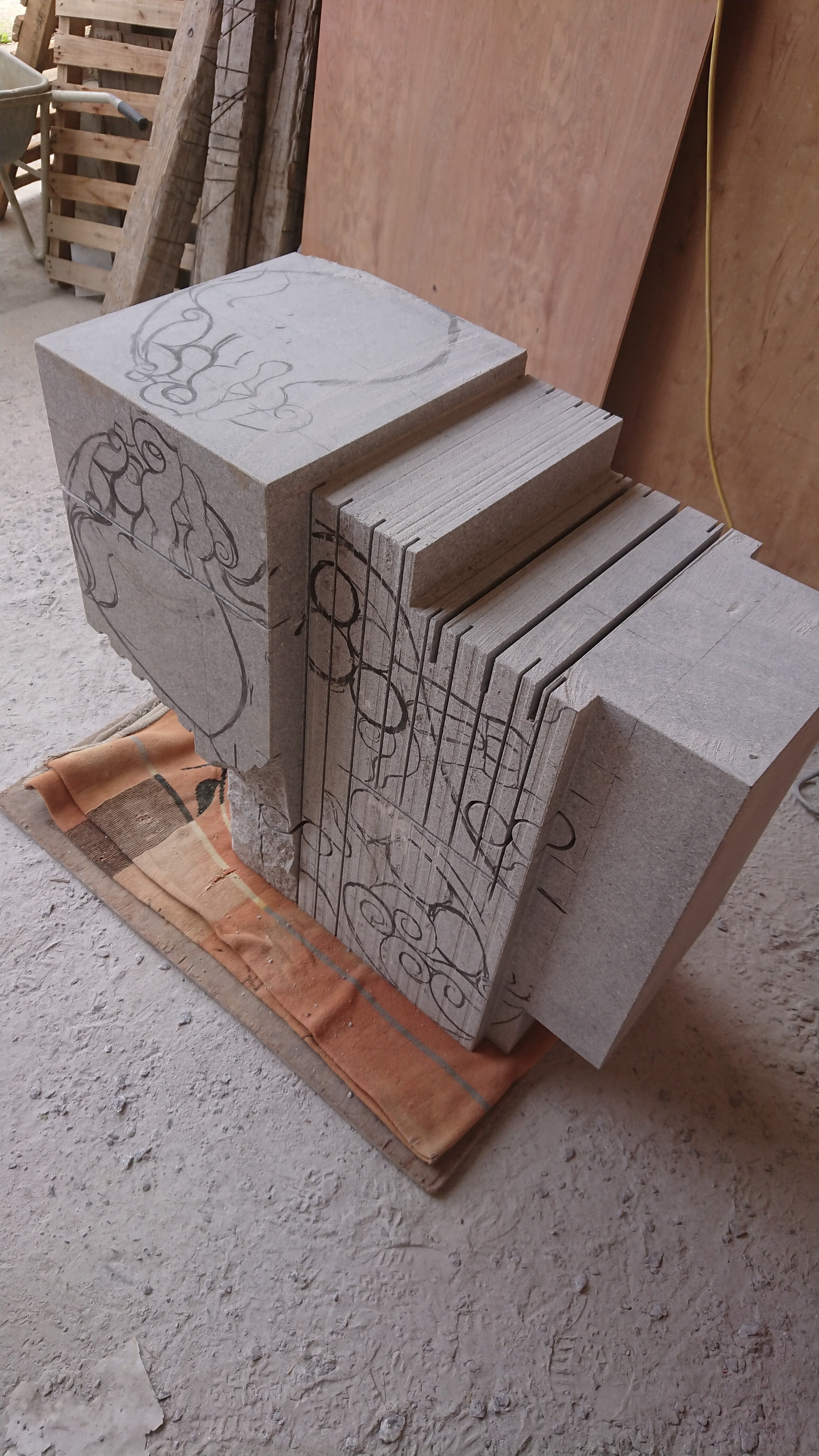 高島市の中村石材(株)さんから持って帰ってきた石をうちの工場でもう少し切りこみを入れていきます。