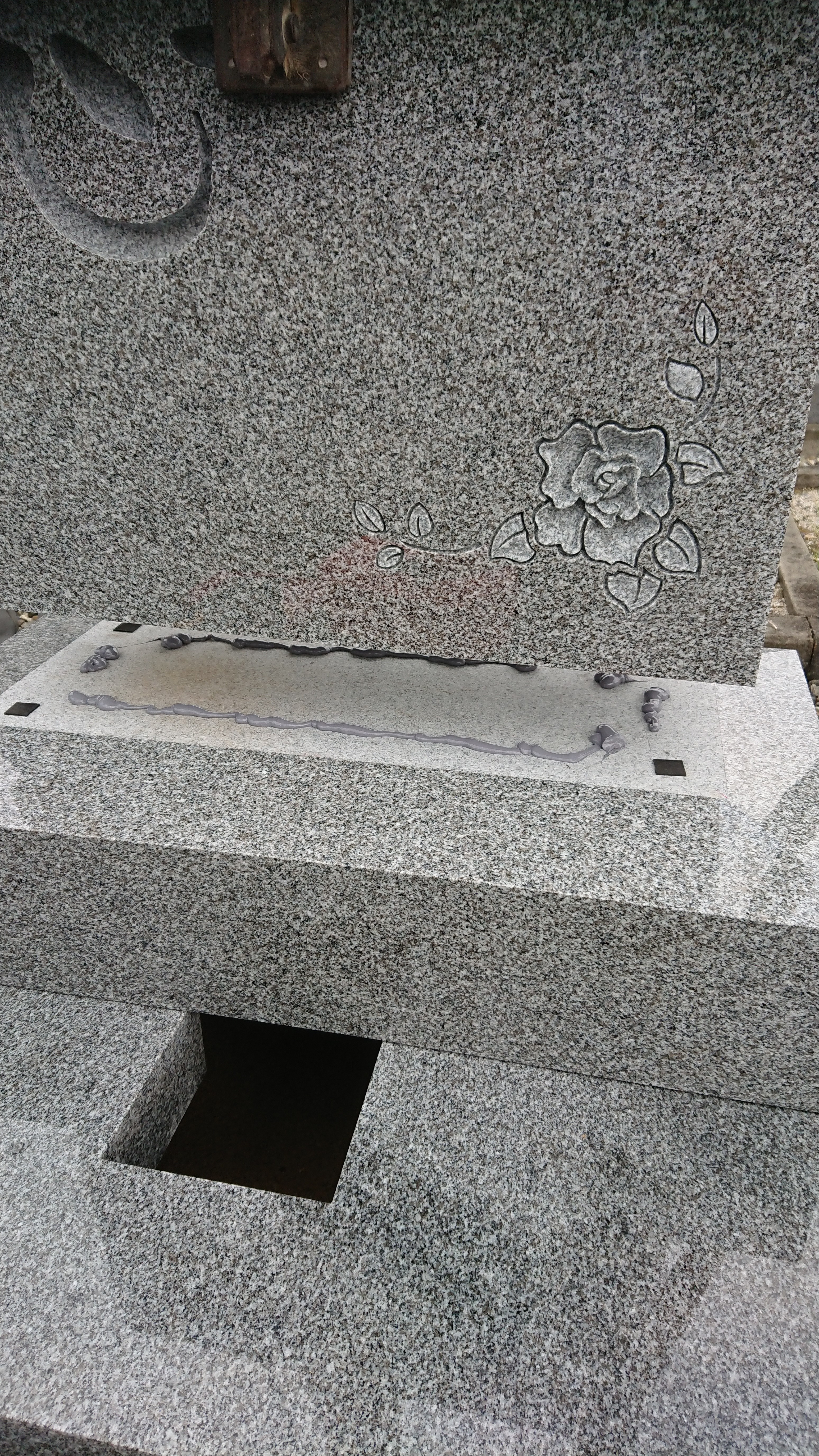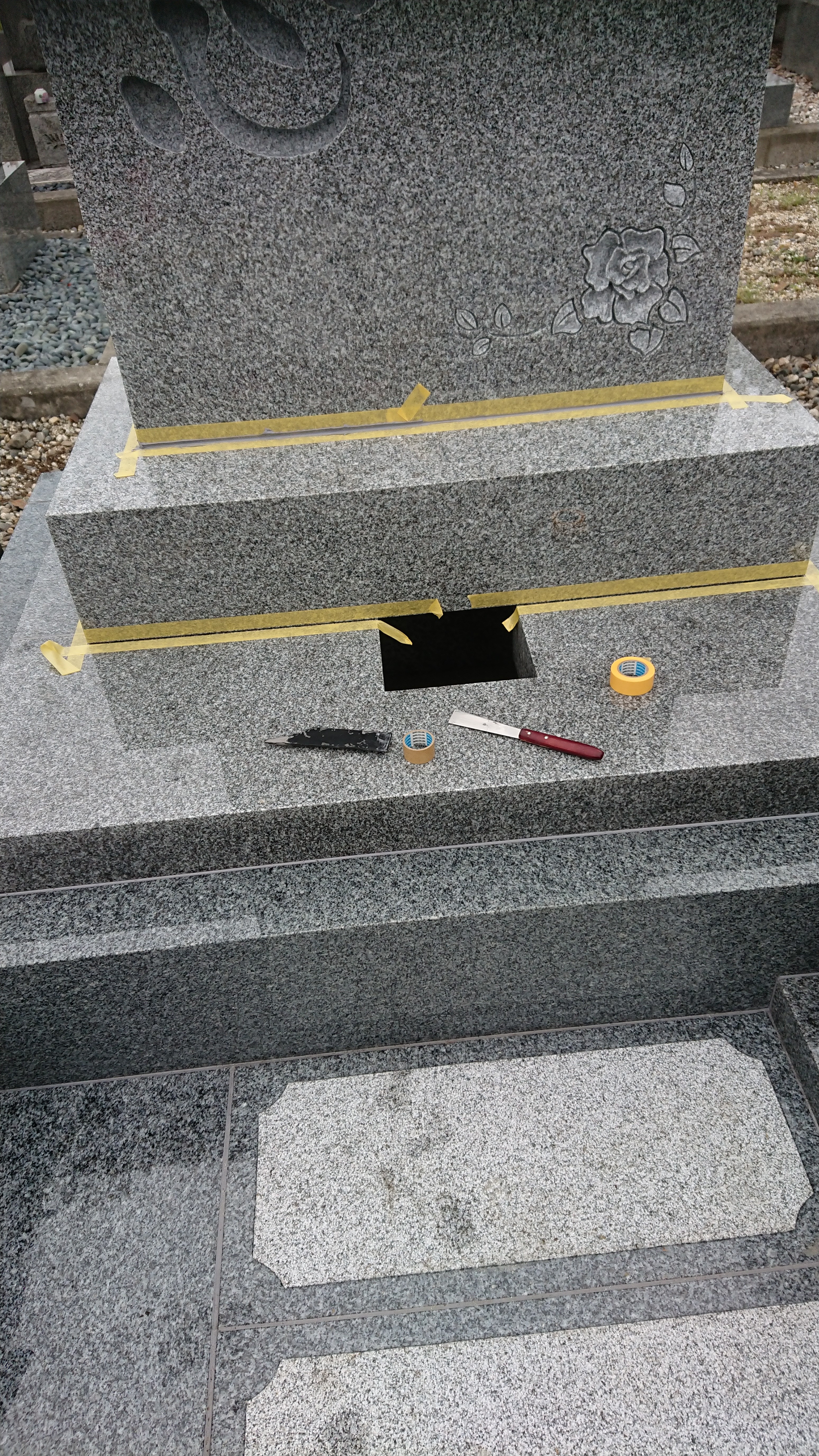 花立をボンドで据え、コーキング目地をして供物台を置いて完成です。