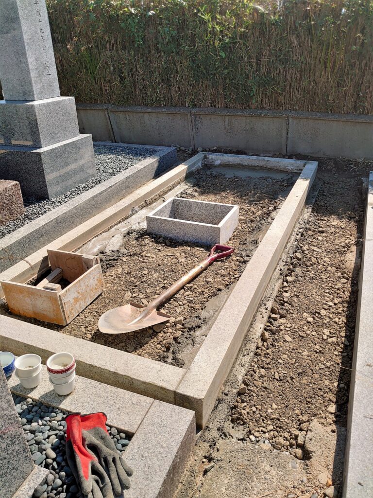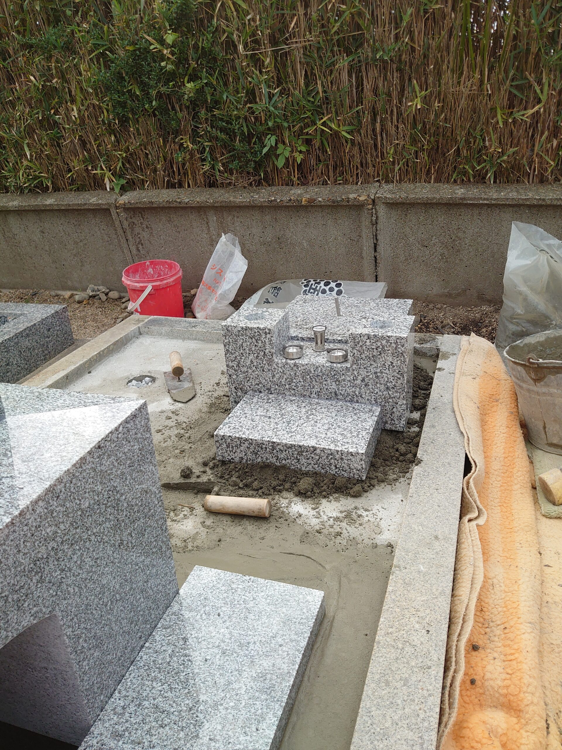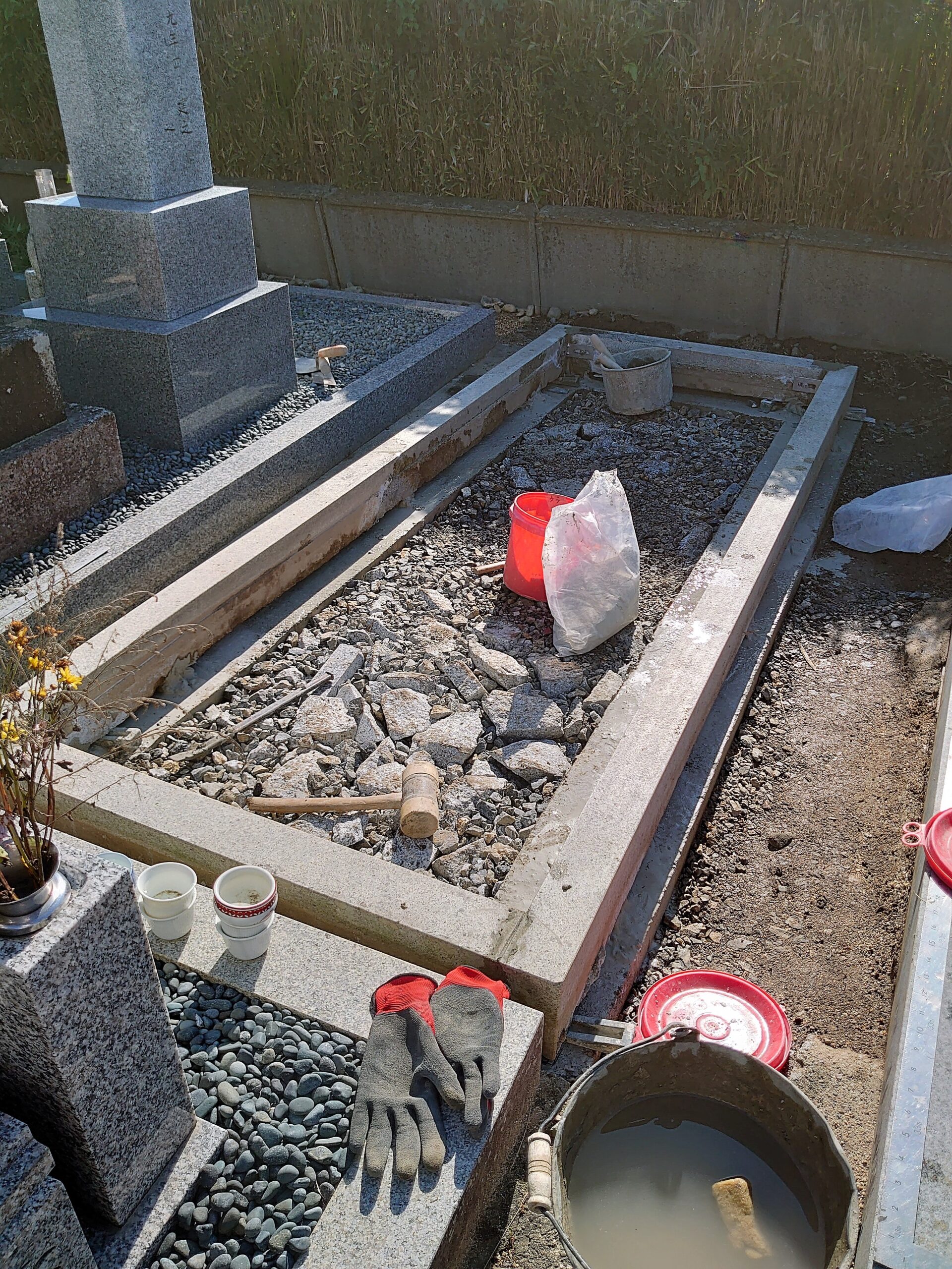 モルタルを詰めて納骨室の石を据え付け砕石を入れます。