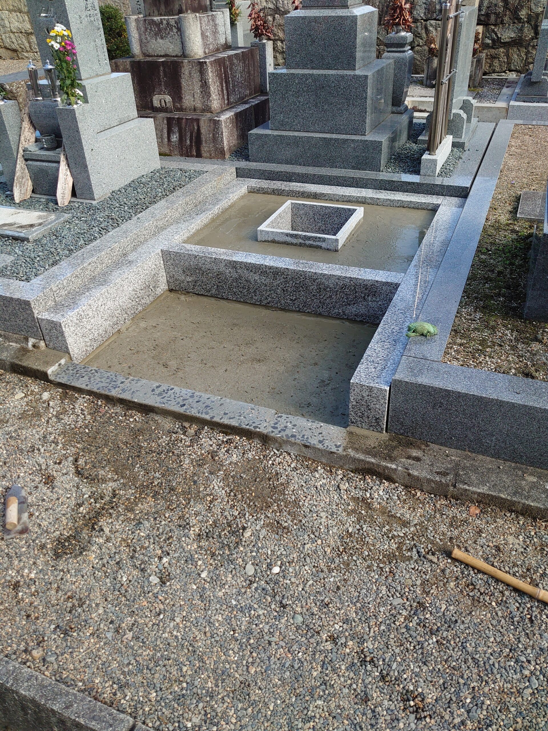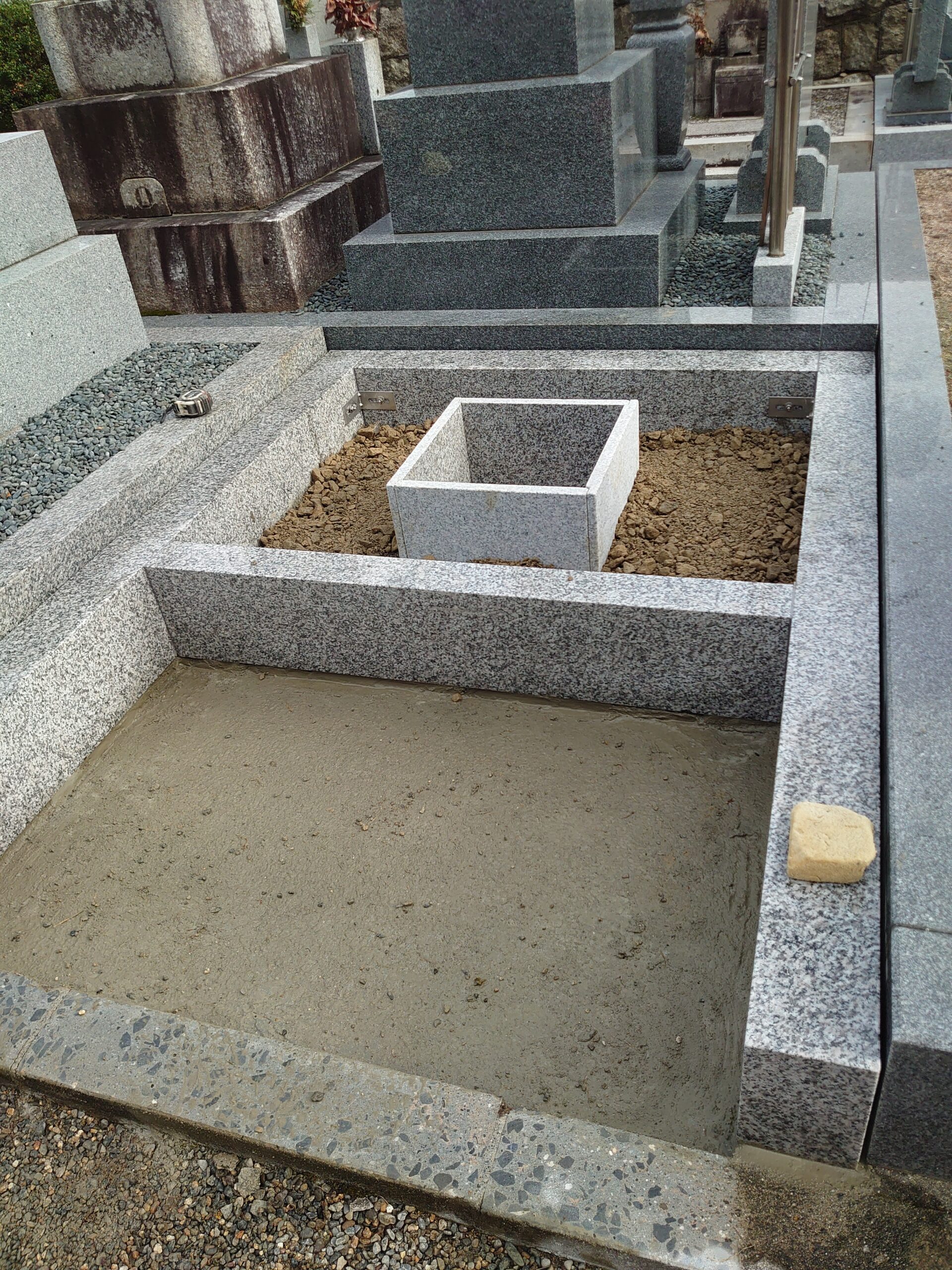 モルタルを詰めて石の納骨室を据え付け砕石を入れます。