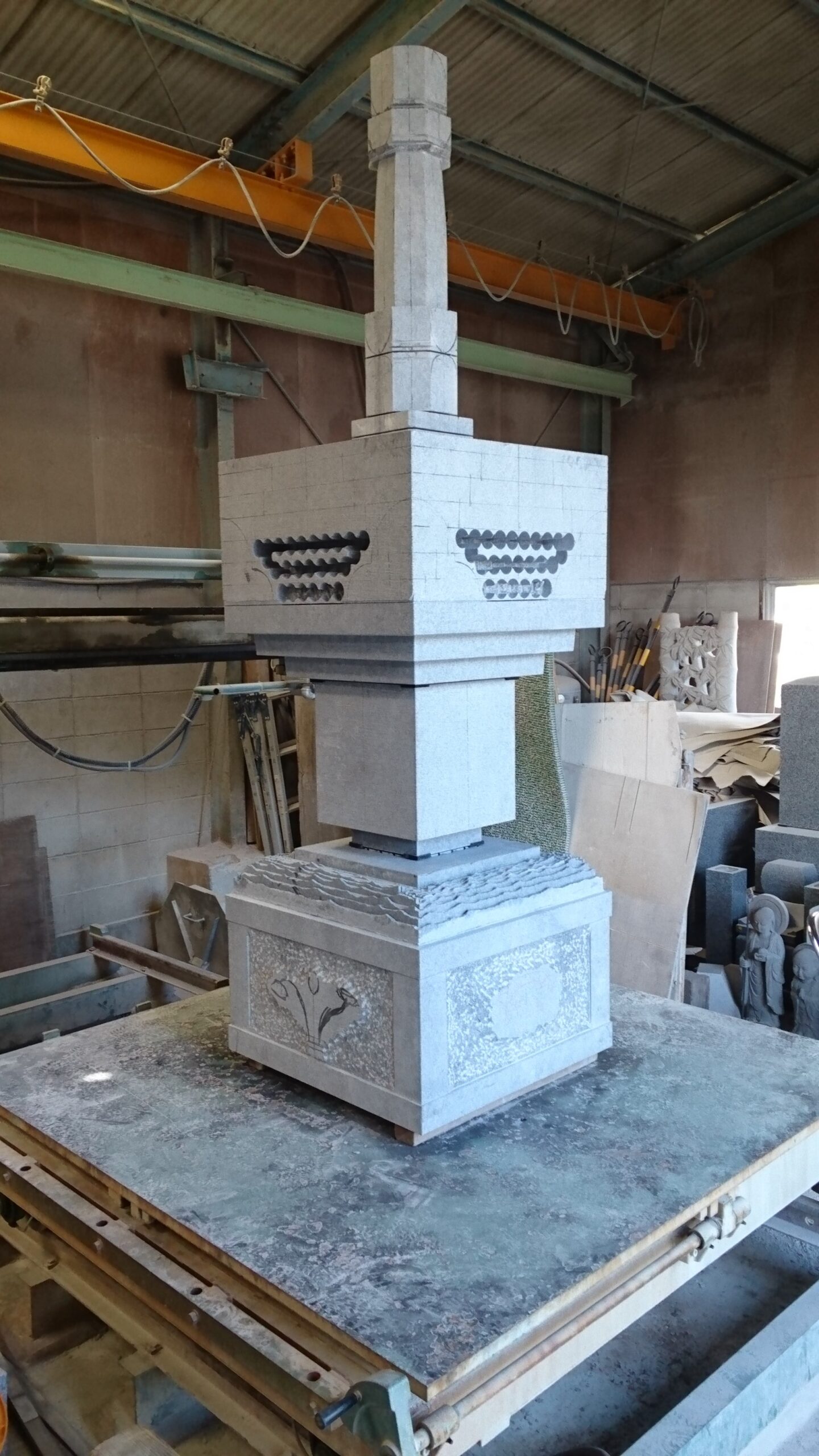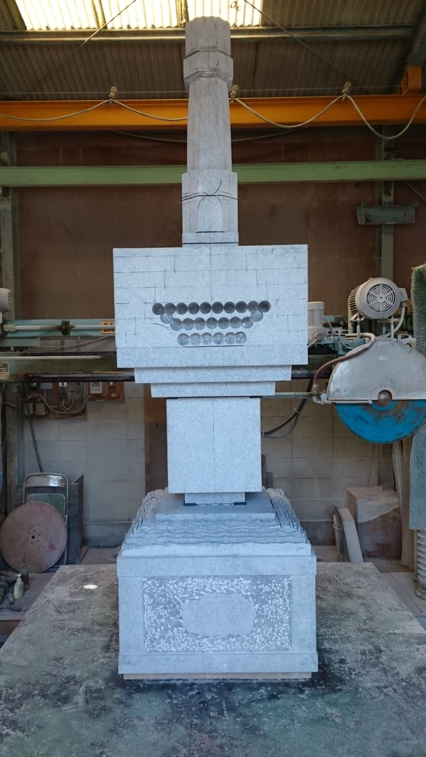 05Sep「宝篋印塔・またまたのせちゃいました!! 滋賀県石材組合連合会40周年記念 12 」ブログ このブログはわしがブログを始める前にfacebookページで投稿したものです。 ブログとして残しておきたいので書き直します。 多少言葉を変えて書くところもございます。 平成27年( 2015 )の話です。 平成27年( 2015 )9月15日投稿 宝篋印塔( 供養塔 )の傘の下場の階段状と基礎の格狭間の所がはつれたので のせちゃいました!! 少しできてきた。 あまり変わり映えせんような(笑) 次のせる時はもう少し変わってると思います(笑) 次回の記事はコチラ 「宝篋印塔・塔身の形づくり!! 滋賀県石材組合連合会40周年記念 13 」 | 【石大 兼子石材店】滋賀県近江八幡市の石彫刻のできる墓石店宝篋印塔( 供養塔 )の塔身の形を作っていきます。 ワイヤーソーで切っているため小さな段が出来たり、キッチリ真っすぐに切れません。 なので面を真っすぐに直していきます。 まずサンダーで四方を切っていきます。 前回の記事はコチラ 「宝篋印塔・基礎石の加工中! 滋賀県石材組合連合会40周年記念 11 」 | 【石大 兼子石材店】滋賀県近江八幡市の石彫刻のできる墓石店宝篋印塔( 供養塔 )の基礎石の周りの小たたきが終わり次は~! 格狭間( こうざま )の部分です。 真ん中の絵が残っているのは、近江式文様と呼ばれる彫刻の部分です。 後で開蓮華・三茎蓮や孔雀を彫るので残しています。 近江式文様とは、格狭間に彫られた開蓮華・三茎蓮や孔雀などの文様の事 兼子石材店やはり庵治石はしっかりした硬い石や~! 関連する記事: 「宝篋印塔・基礎石の加工中! 滋賀県石材組合連合会40周年記念 11 」 「宝篋印塔・またまたのせちゃいました !! 滋賀県石材組合連合会40周年記念 22 」 「宝篋印塔・基礎の下の台小たたき加工 !! 滋賀県石材組合連合会40周年記念 24 」 「宝篋印塔・基礎、格狭間の中に近江式文様加工 !! 滋賀県石材組合連合会40周年記念 20 」 「宝篋印塔・基礎、格狭間の中に近江式文様加工 !! 動画編 滋賀県石材組合連合会40周年記念 21 」 「宝篋印塔・基礎に格狭間 (こうざま )加工 !! 滋賀県石材組合連合会40周年記念 18 」