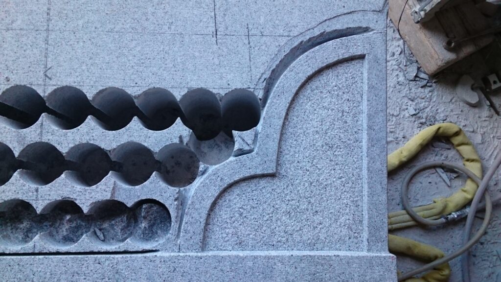 - 隅やビシャンが押せなかった所をエアーハンマーのノミで形を作っていきます。