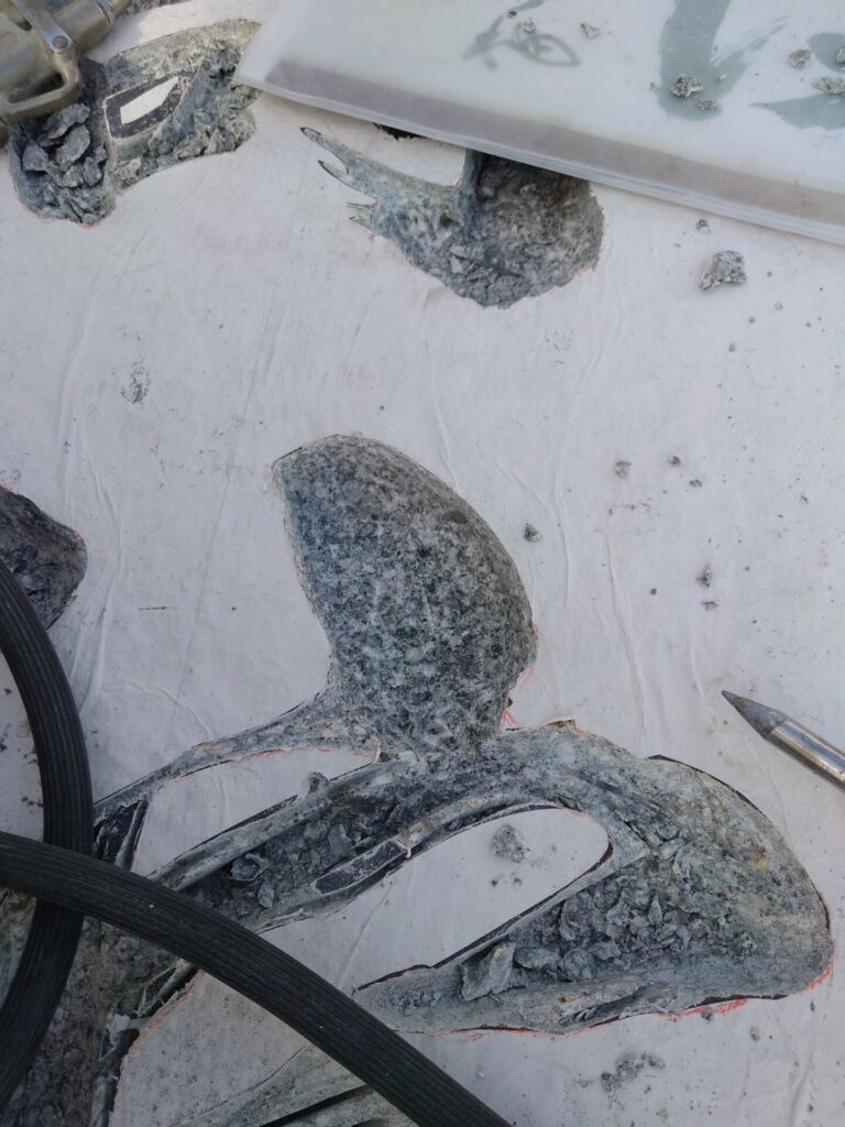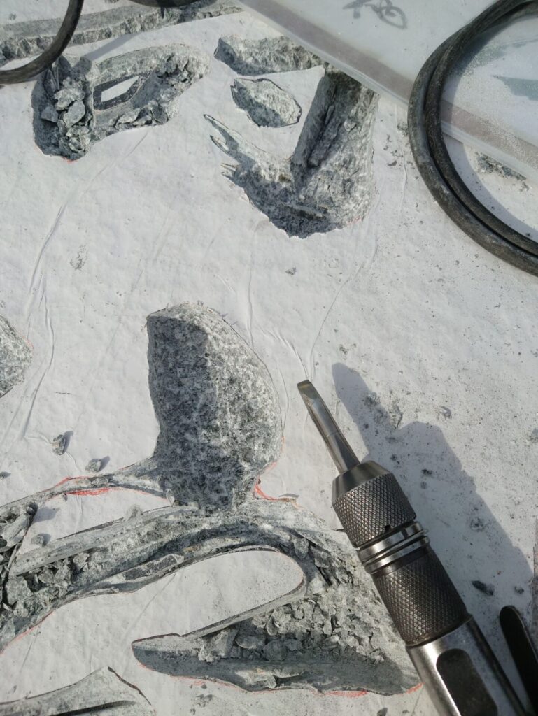 ドリルで彫りすぎてないかがわかるエアーハンマーのノミでの形づくり。