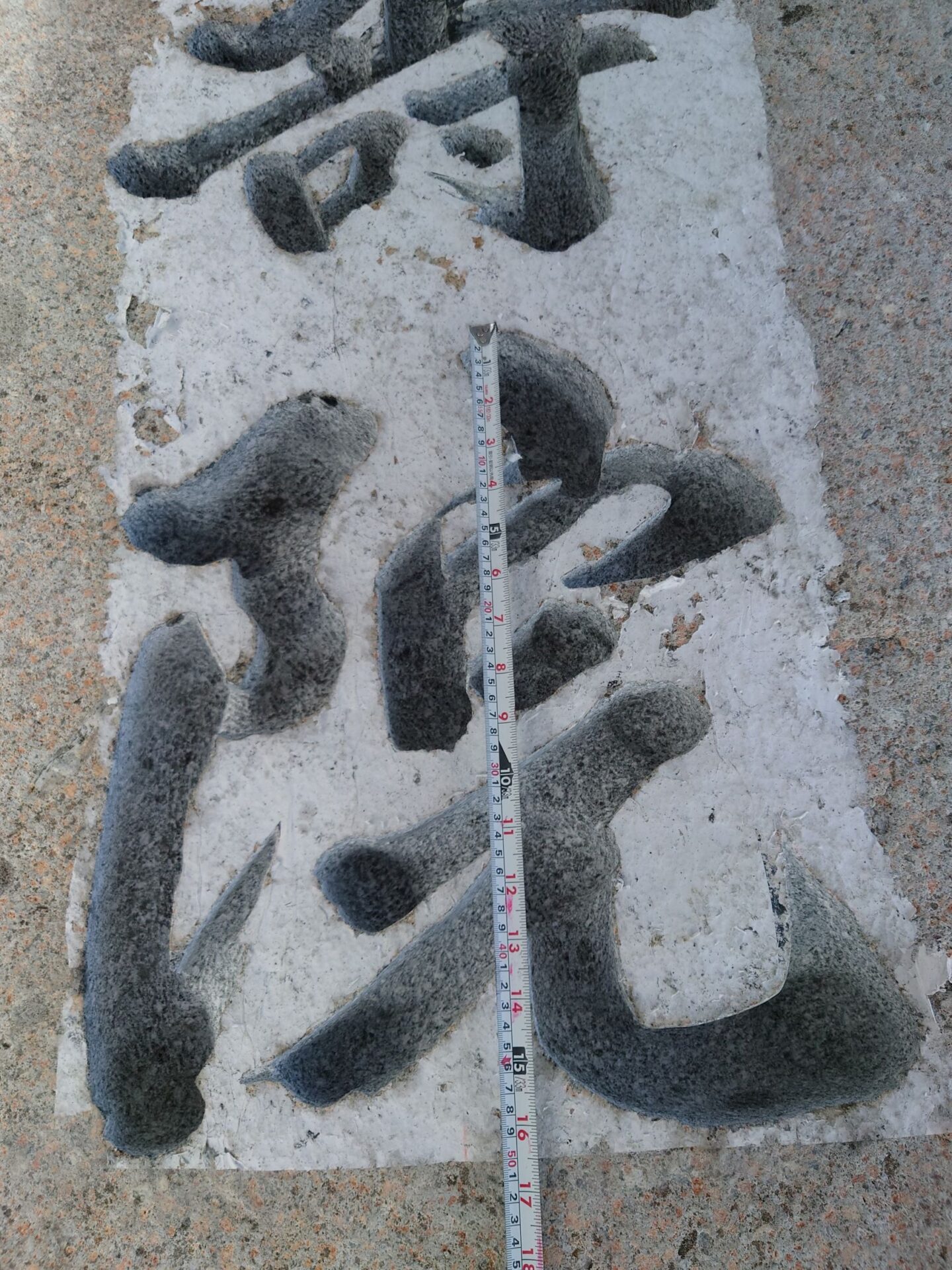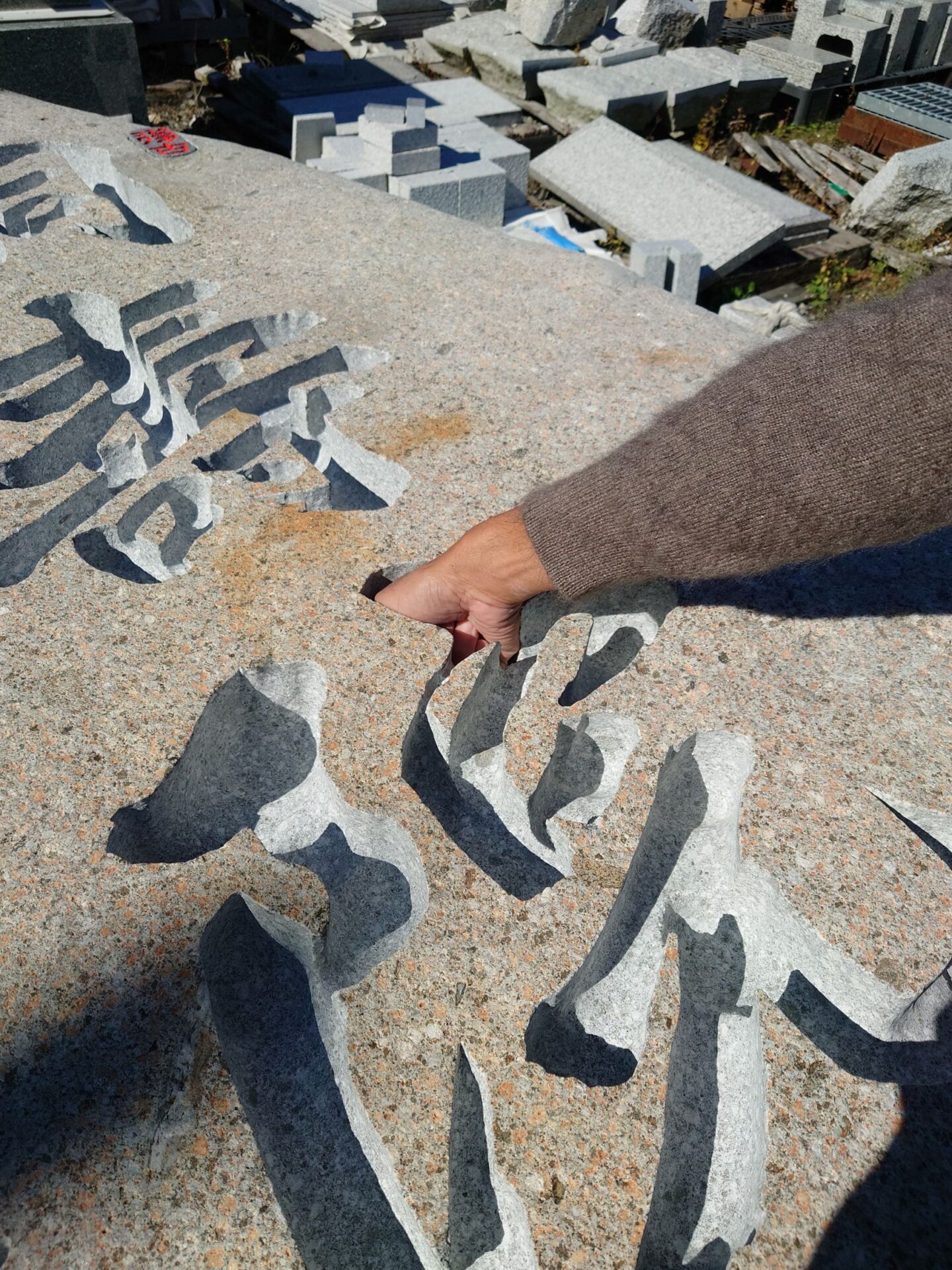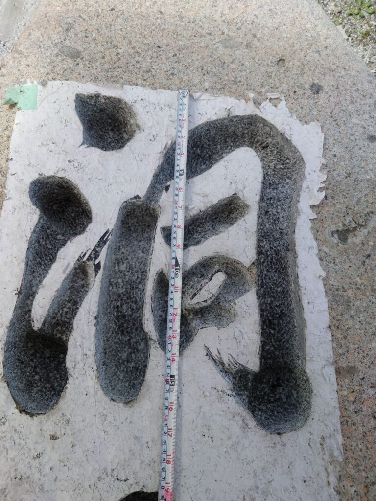 落款が来るところに墨を付けてサンダーの薄刃で切りドリルで穴を掘りエアーハンマーのノミで彫っていきます。