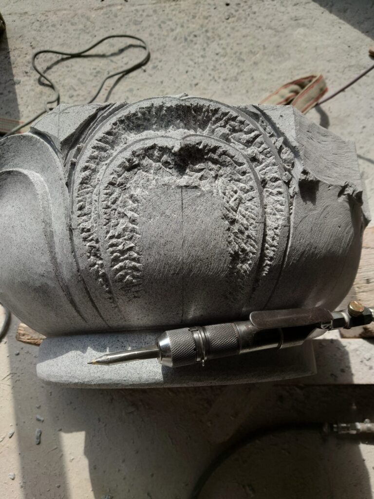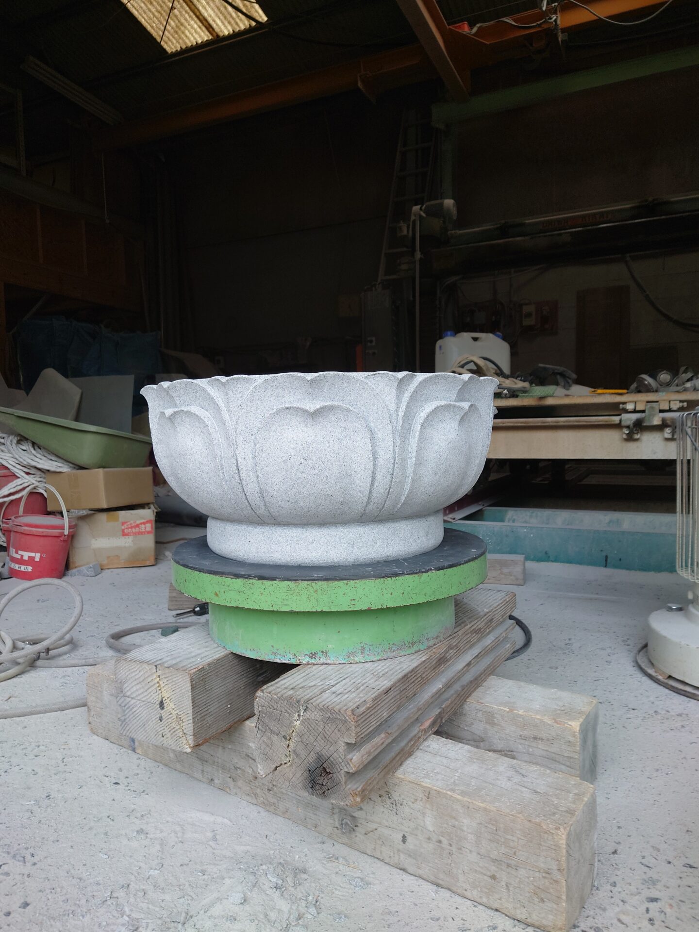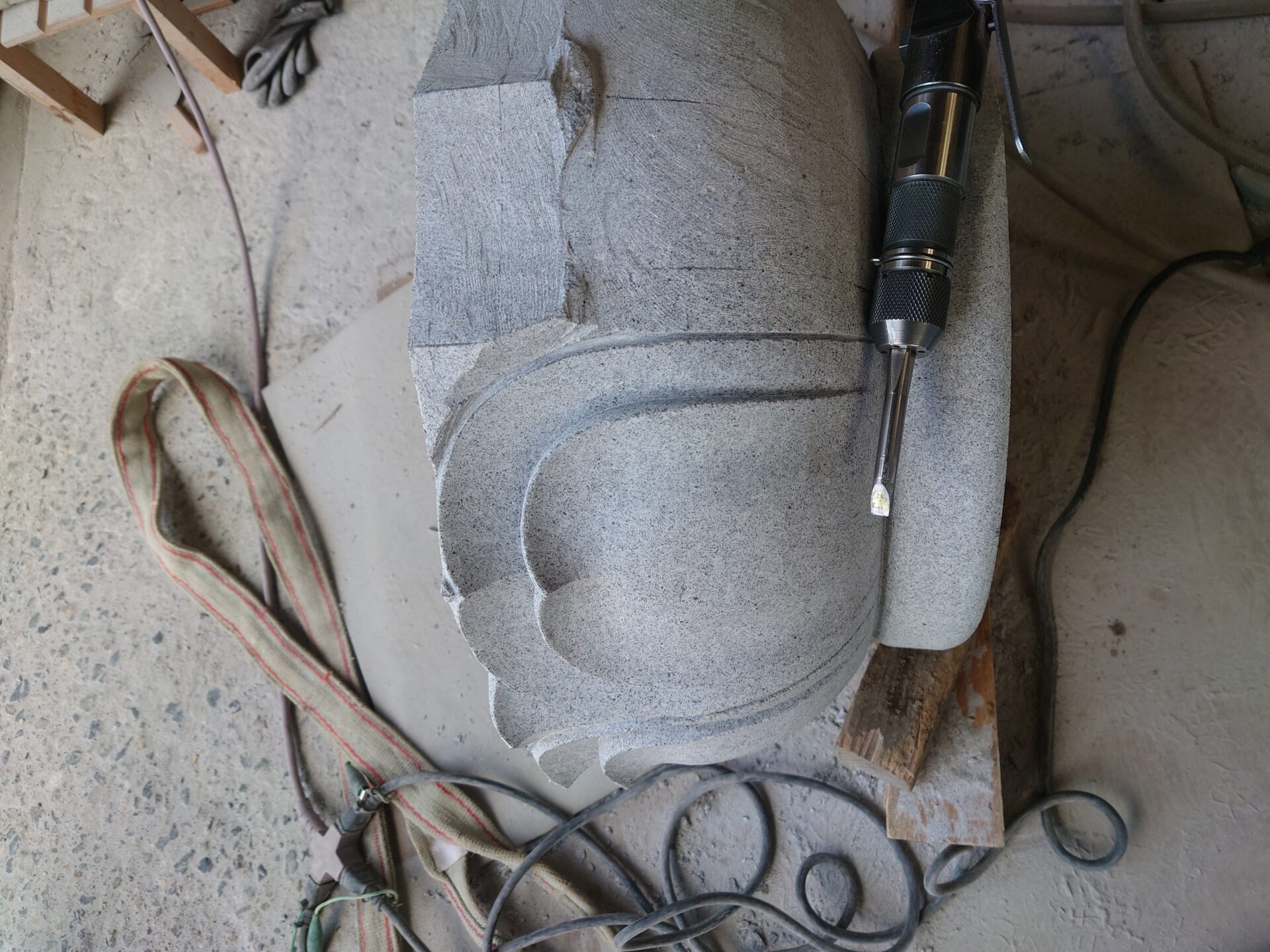 01Sep「 JR安土駅前に釈迦苦行像作らせて頂きました! 8/11 」ブログ 蓮華の花びらを作っていきます。 まずはサンダーの薄刃で花弁の外側を切ります。 エアーハンマーのノミで花弁の形を作ります。 動画です。(1.5倍速) サンダーのカップでこすって形を綺麗に仕上げていきます。 エアーハンマーのコベラで底を突いたりサンダーの薄刃で切れない所を加工していきます。 最後にエアーハンマーのコベラとサンダーの薄刃で天場を加工したら完成です。 こんな感じに仕上がりました。 いよいよ苦行像の完成です。 お楽しみに! 次回の記事はコチラ 「 JR安土駅前に釈迦苦行像作らせて頂きました! 9/11 」 | 【石大 兼子石材店】滋賀県近江八幡市の石彫刻のできる墓石店ここまで出来てくると出来上がりの感じが大分見えてくる。 最後の仕上げです。 目の周りもこんな感じに仕上げました 前回の記事はコチラ 「 JR安土駅前に釈迦苦行像作らせて頂きました! 7/11 」 | 【石大 兼子石材店】滋賀県近江八幡市の石彫刻のできる墓石店粗切りが終わった蓮華の天場から加工していきます。 角をややアールを付けて取っていきます。 2枚の写真でどういう 関連する記事: 「 JR安土駅前に釈迦苦行像作らせて頂きました! 9/11 」 「 JR安土駅前に釈迦苦行像作らせて頂きました! 7/11 」 「 JR安土駅前に釈迦苦行像作らせて頂きました! 5/11 」 「 JR安土駅前に釈迦苦行像作らせて頂きました! 6/11 」 「 JR安土駅前に釈迦苦行像作らせて頂きました! 2/11 」 「 JR安土駅前に釈迦苦行像作らせて頂きました! 3/11 」