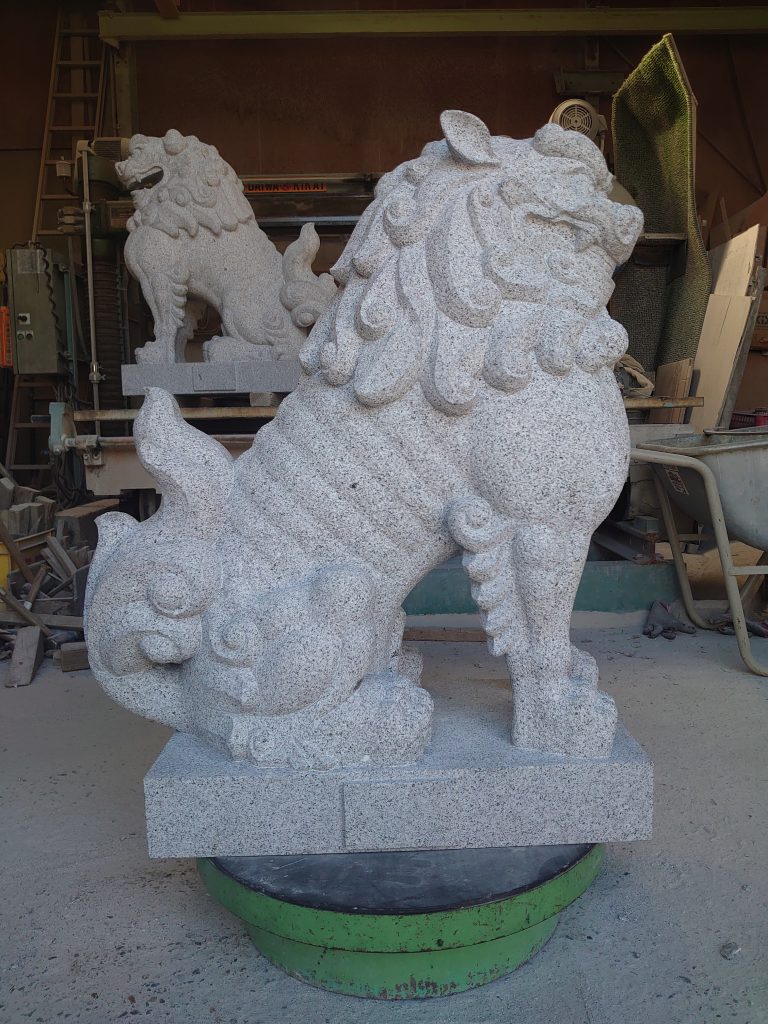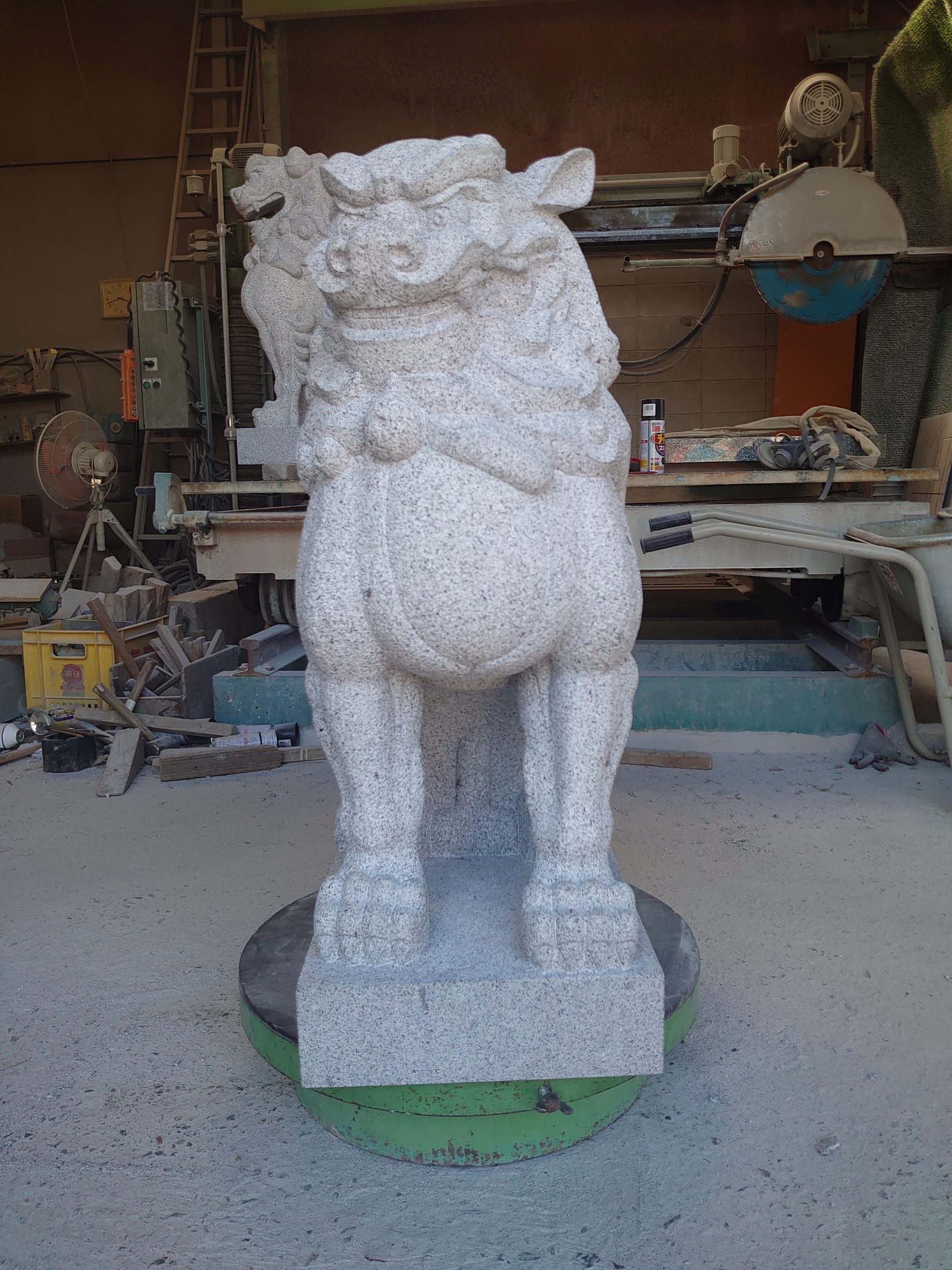 17Mar狛犬 19 古代型・吽型 展示品 展示用に古代型の狛犬を作りました。 大きさは、台の下から頭の上までで2尺5寸(約76㎝)です。 石種 額田中目石(愛知県) 古代型狛犬の制作ブログはコチラ 「やっと出来た2尺5寸古代型狛犬(展示用(涙))!!」 | 【石大 兼子石材店】滋賀県近江八幡市の石彫刻のできる墓石店暇に任せて作り出した狛犬。 まだブログではなくFacebookページでの投稿をしていた時。 いつ頃作り始めたか 兼子石材店 工場はコチラ